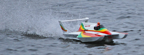 The model: Dave bought the boat from a member of ERCU to race in CT for 2010 and to race in some NAMBA rules races in the future. The boat is fast and Dave is trying to trim it out so that it doesn't fly away on him. This is a very pretty boat and look for it to show improvement in the ride as he tames it down.