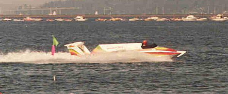 The real boat: The hull started life as the 8th Miss Budweiser in 1976. After being sold in 79, it ran as the Miss Tri-Cities. The boat was reconfigured to seat the driver up front and was renamed the Thousand Trails in 81. It also raced as a Miss Prodelco, Budweiser Light, American Speedy Printing and Lite All-Star II in later years.